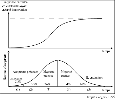 Cet article rappelle notamment que, selon la théorie de la diffusion de l’innovation de Everett Rogers (le père du célèbre schéma ci-contre), une technologie est plus susceptible de se voir adoptée quand elle paraît compatible avec les processus de travail déjà en place dans une organisation; quand il est possible de la tester à petite échelle avant de l’institutionnaliser; quand cette technologie paraît meilleure que les autres ou que son usage produit une amélioration de la situation actuelle; quand elle est conviviale ou peu complexe et quand ses utilisateurs potentiels ou actuels peuvent discerner concrètement ses effets.